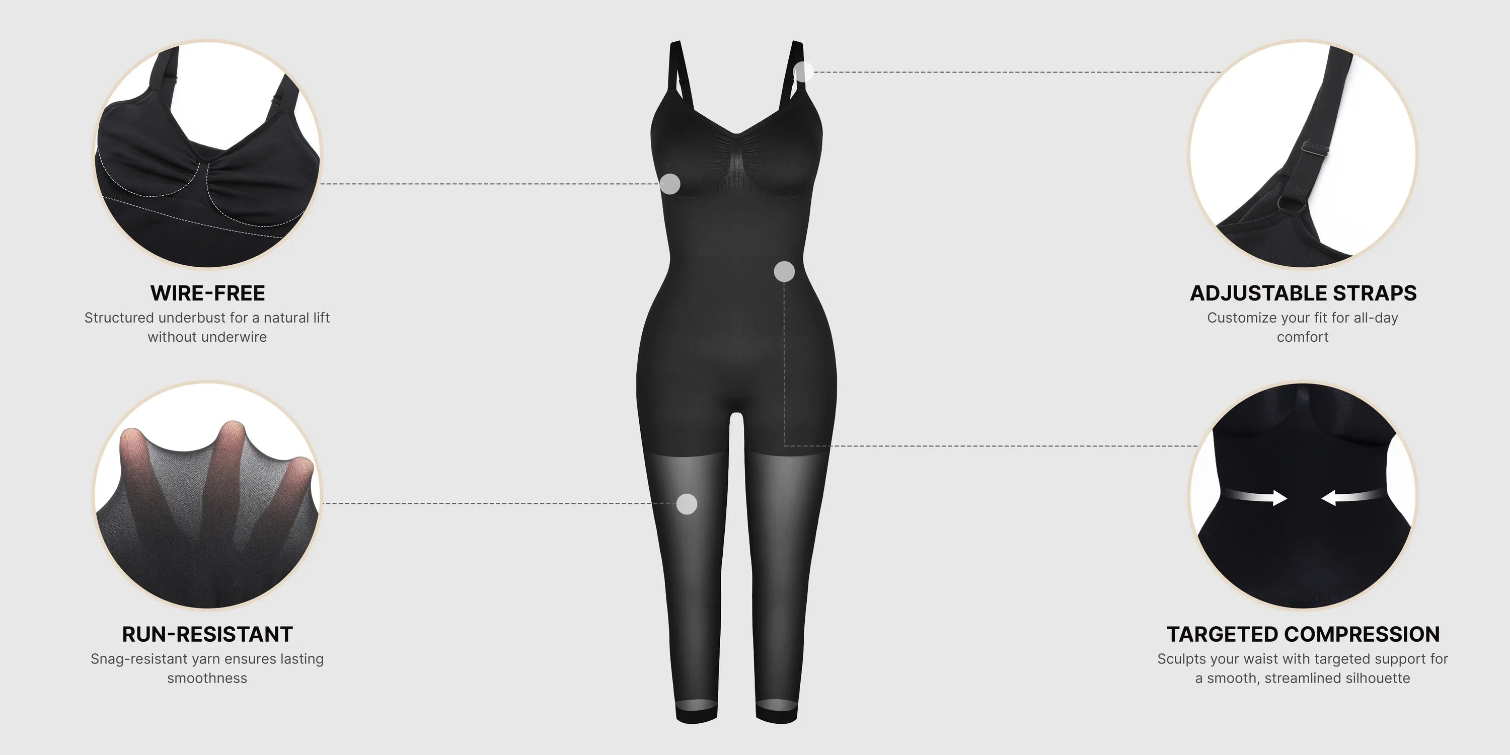 Why you'll love it!• 4-in-1 design — your all-in-one solution for bra, panty, shapewear, and sheer tights.• Four-way stretch fabric offers lightweight, comfortable bust support.• Wire-free comfort with a supportive under-bust band.• Targeted compression with structured fabric flattens the stomach, lifts the glutes, and smooths the thighs.• The mid-thigh shaper seamlessly extends into breathable sheer mesh for precision sculpting.• Premium, breathable yarns eliminate chafing and offer superior durability for everyday wear.• Adjustable straps for a personalized fit.• Overlapping gusset with antimicrobial lining allows underwear-free wear.